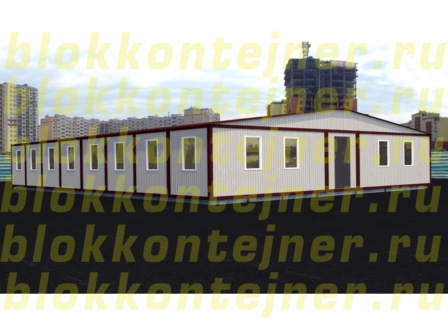 Одноэтажное модульное общежитие из 16-ти шт БК, с коридором 1,5м